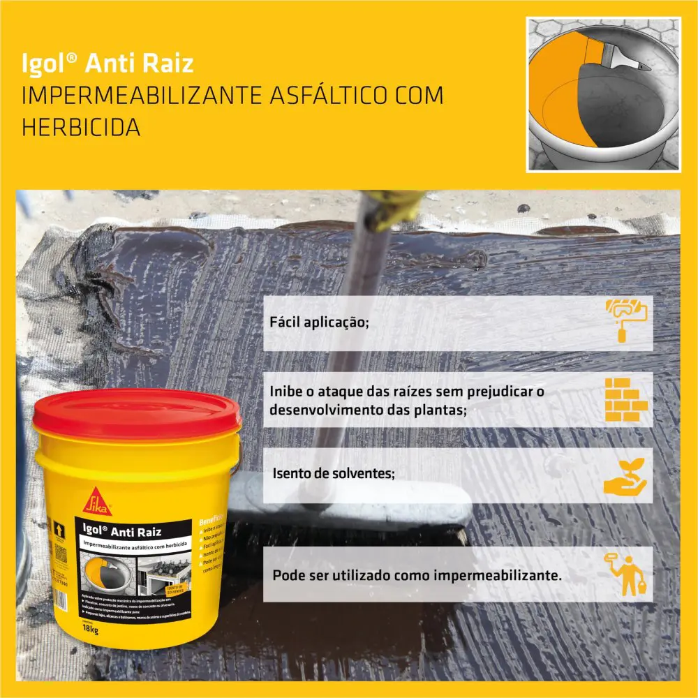 Igol Anti Raiz é uma emulsão asfáltica de base água, enriquecida com herbicida, especialmente desenvolvida para proteger estruturas contra a penetração de raízes, além de atuar como impermeabilizante eficiente para concreto, alvenaria e argamassa.