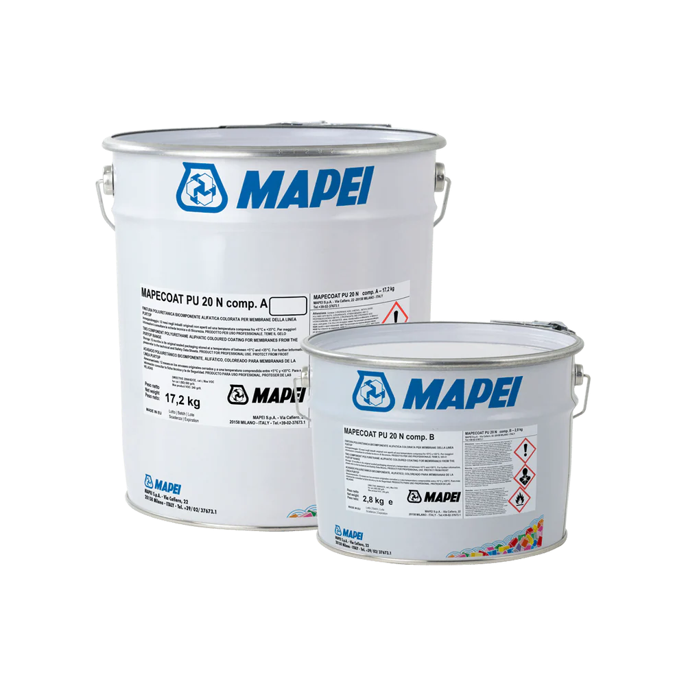 O Mapecoat PU 20 N é um líquido, acabamento de poliuretano alifático bicomponente. Possui uma relação de mistura (A/B em peso) de 4,3:0,7 e um tempo de vida da mistura de aproximadamente 60 minutos a +23°C. Pode ser aplicado com rolo ou pulverização airless, com um consumo por demão de cerca de 0,15-0,2 kg/m². A transitabilidade pedonal é possível após 24 horas a +23°C. Está disponível em kits de 15 kg. As cores incluem bege, branco, vermelho, preto e tons de cinzento.