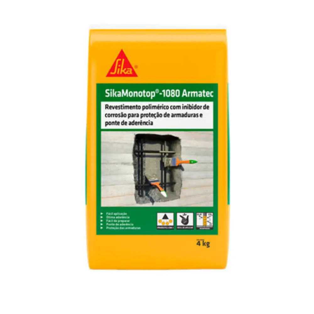 O Sika MonoTop 1080 Armatec é uma argamassa cimentícia monocomponente, polimérica e pré-dosada, projetada para atuar como ponte de aderência e proteção de armaduras em estruturas de concreto.